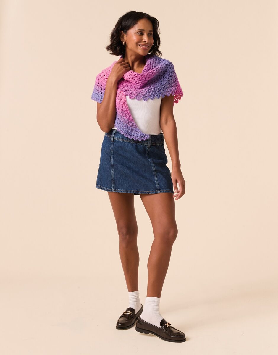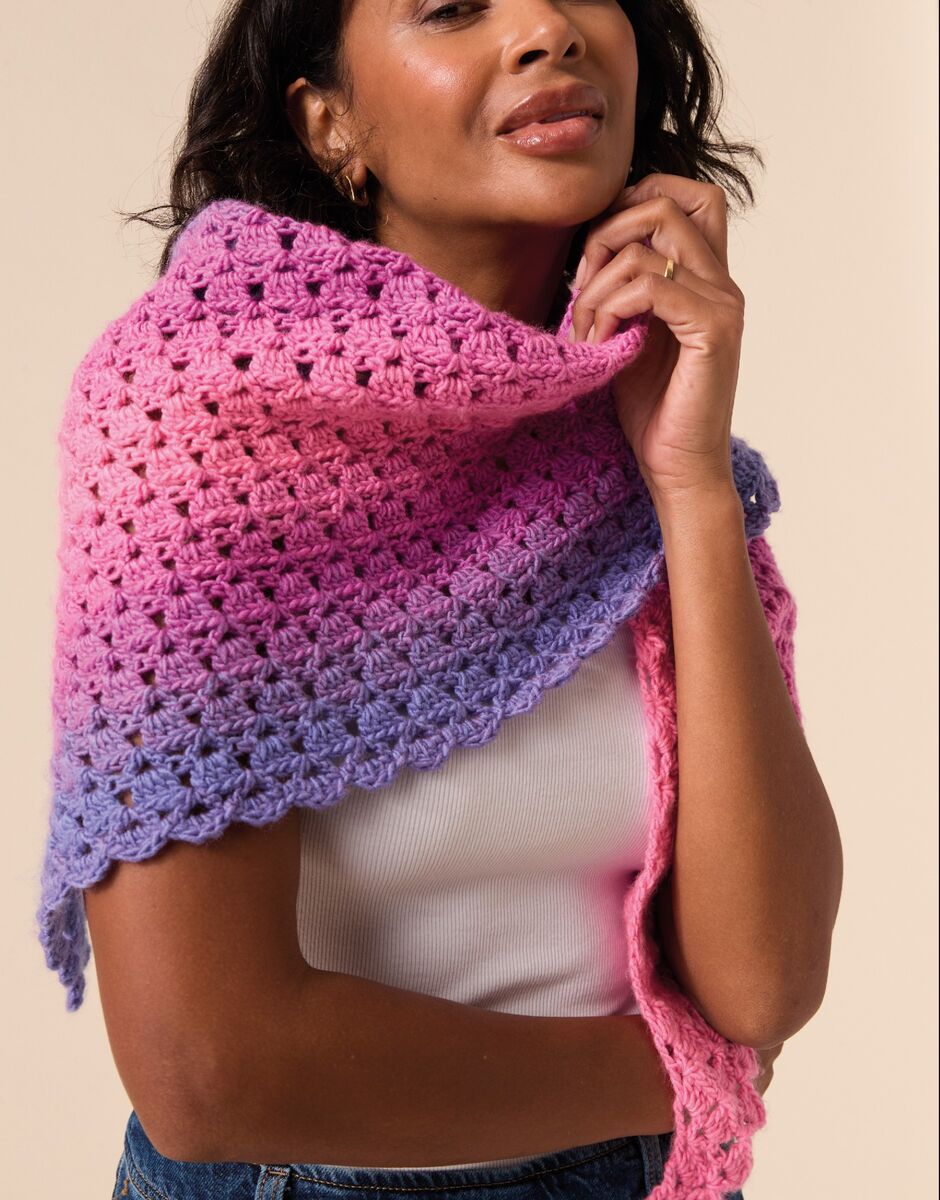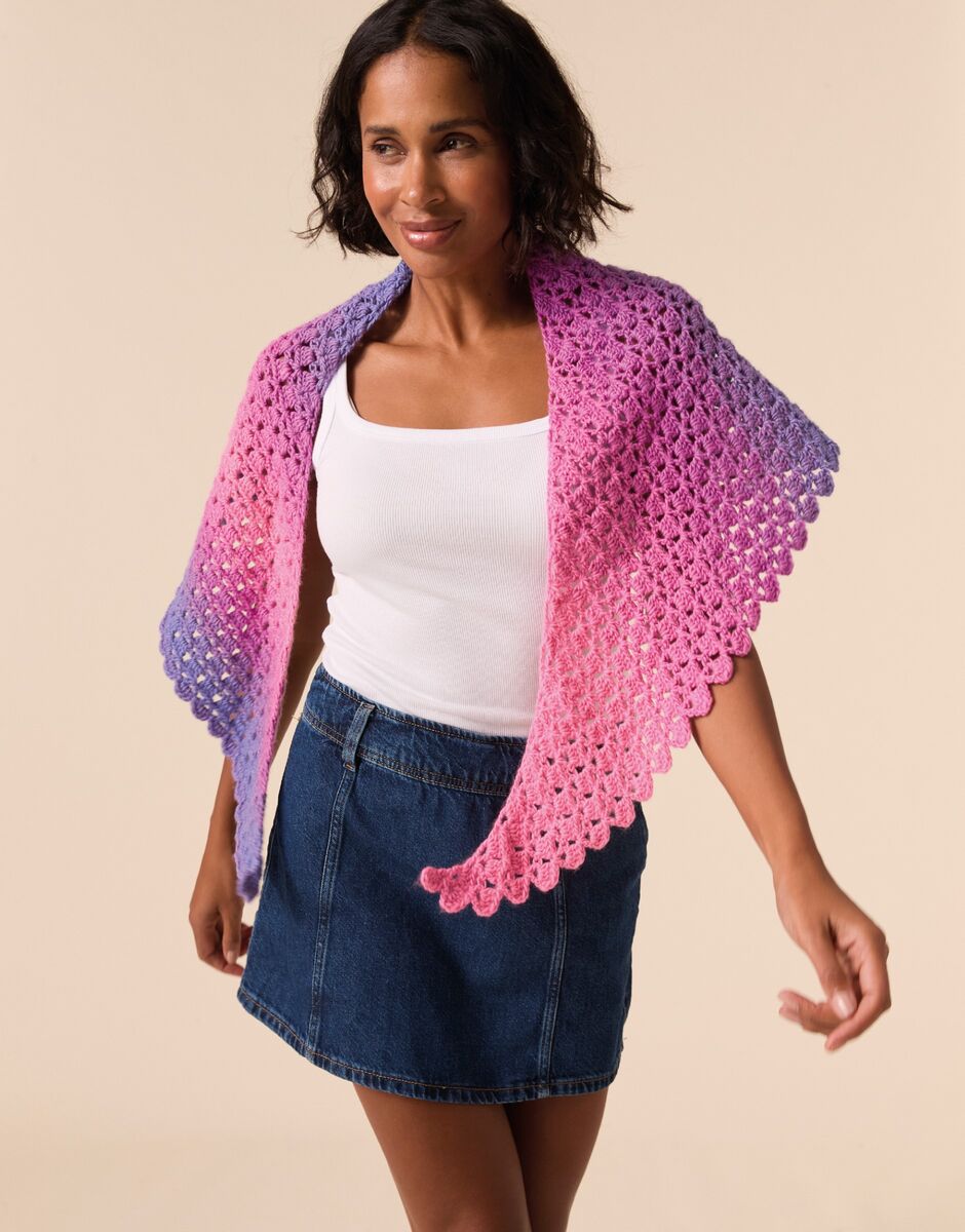 Crochet this beautiful shawl with just one ball of Jewelspun Ombre! Work the slightly asymmetric shape from the acute point outwards for an unusual gradient effect. The continuous stitch naturally creates a pretty scalloped edge and you’ll crochet a matching scallop stitch to the short side to finish.