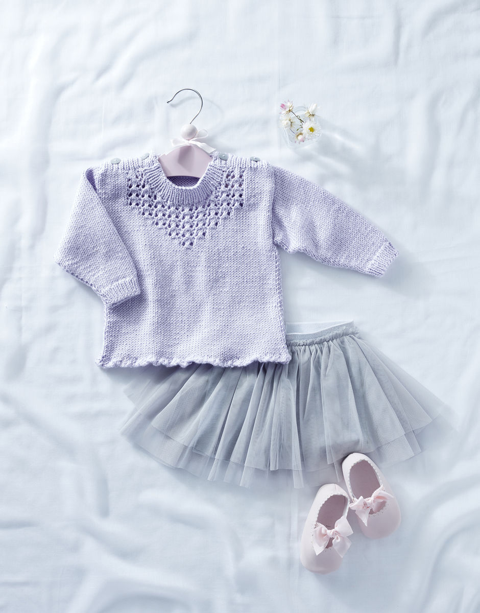 Work on your lace skills with this adorable sweater suitable for intermediate knitters. With shoulder button fastenings this Sirdar Snuggly Soothing Double Knitting sweater can be made for ages from newborn to two years.