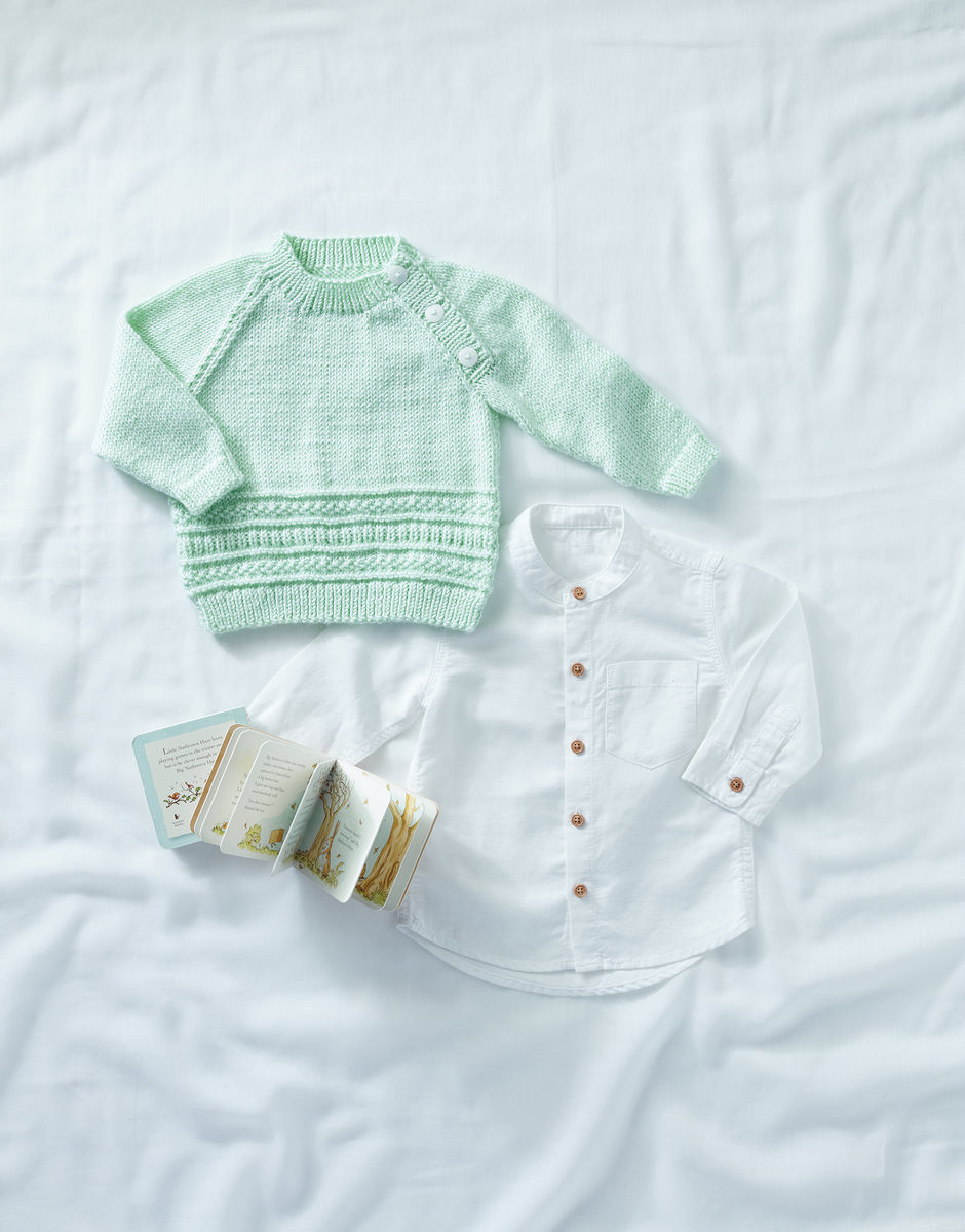 Knit this beautifully textured round-neck sweater, featuring raglan sleeves, and a raglan button opening, for babies aged up to two years. Sirdar Snuggly Soothing Double Knitting is kind to baby's delicate skin and easy to care for.