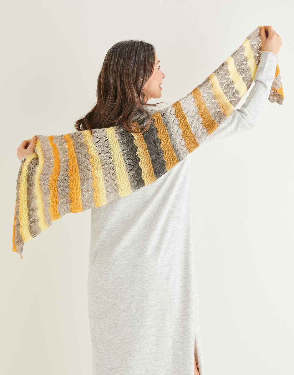 Add a statement and a splash of colour to any of your looks with this crescent shawl. Able to take the most basic of outfits and make it something special, it's a great piece to have in your wardrobe. The striped effect comes from using two Sirdar Shawlie colours.