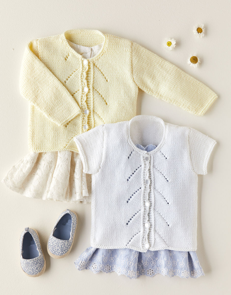 This super sweet cardigan is knitted in our silky-smooth Snuggly Soothing. Using border and eyelet pattern stitch and scalloped trim button placket, this adorable cardigan is perfect for your youngest family member. Knit your choice of either long or short sleeves.