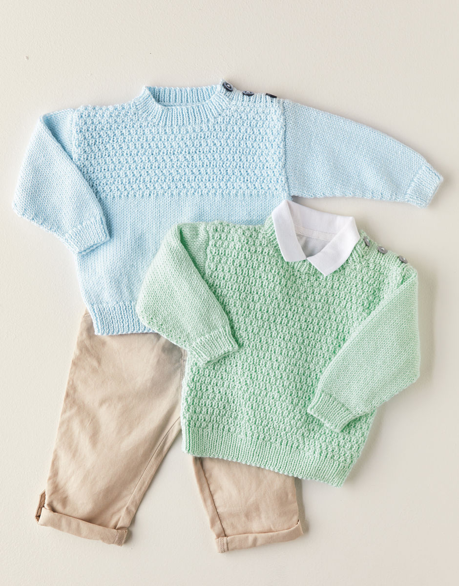 Update your baby’s wardrobe with this textured sweater in Snuggly Soothing. Choose from either a textured yoke or body in this round neck sweater knitted in this silky-smooth yarn which showcases great stitch definition.
