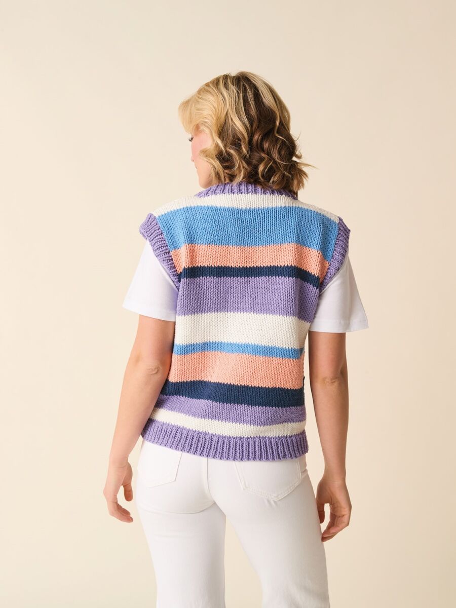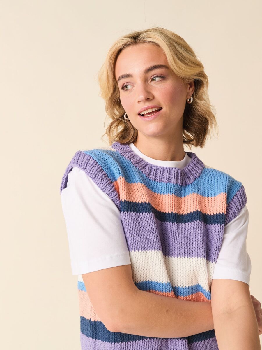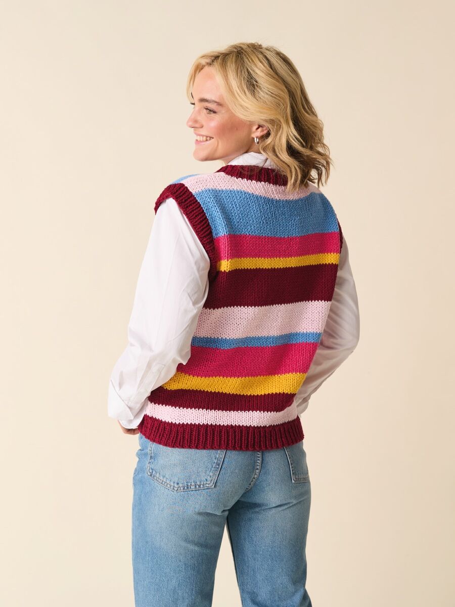 Every wardrobe needs a versatile tank. Knit this one with an on-trend extended shoulder for structure and a tapered set-in armhole for less bulk making it perfect for layering. The quirky stripes, in two fashion-friendly colour-ways, match at the side seams to create neat continuous hoops around the body.