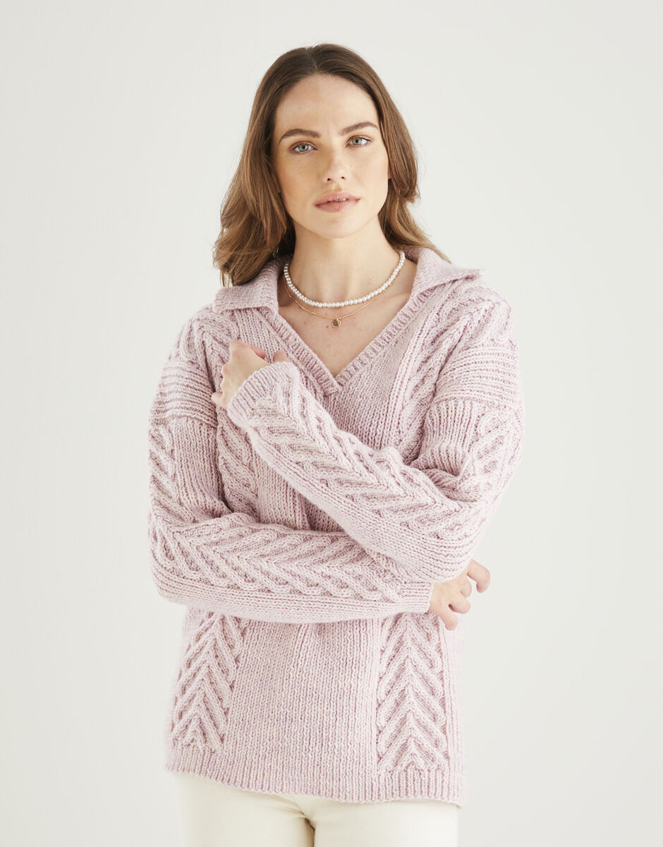 A flattering V Neck Collared Sweater from our Aran Romance Collection. Follow the pattern to create the ribbed central panel framed by pretty cables which also feature on the sleeve. Designed for more experienced knitters to stretch your skills in a modern, feminine Aran jumper.