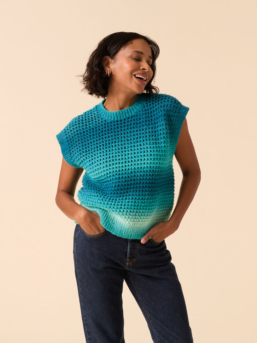 Stunning in any shade of beautiful gradient-effect Jewelspun Ombre, this Tank is knit in the round and bottom up to create effortless circles of continuous colour. Integral edging and a simple split for armholes continues the seamless colour effect, while the stitch creates a beautiful drapey finish. Slight variations in the start point make each ball of Jewelspun Ombre unique, which means that the colour placement in your project will be unique too.