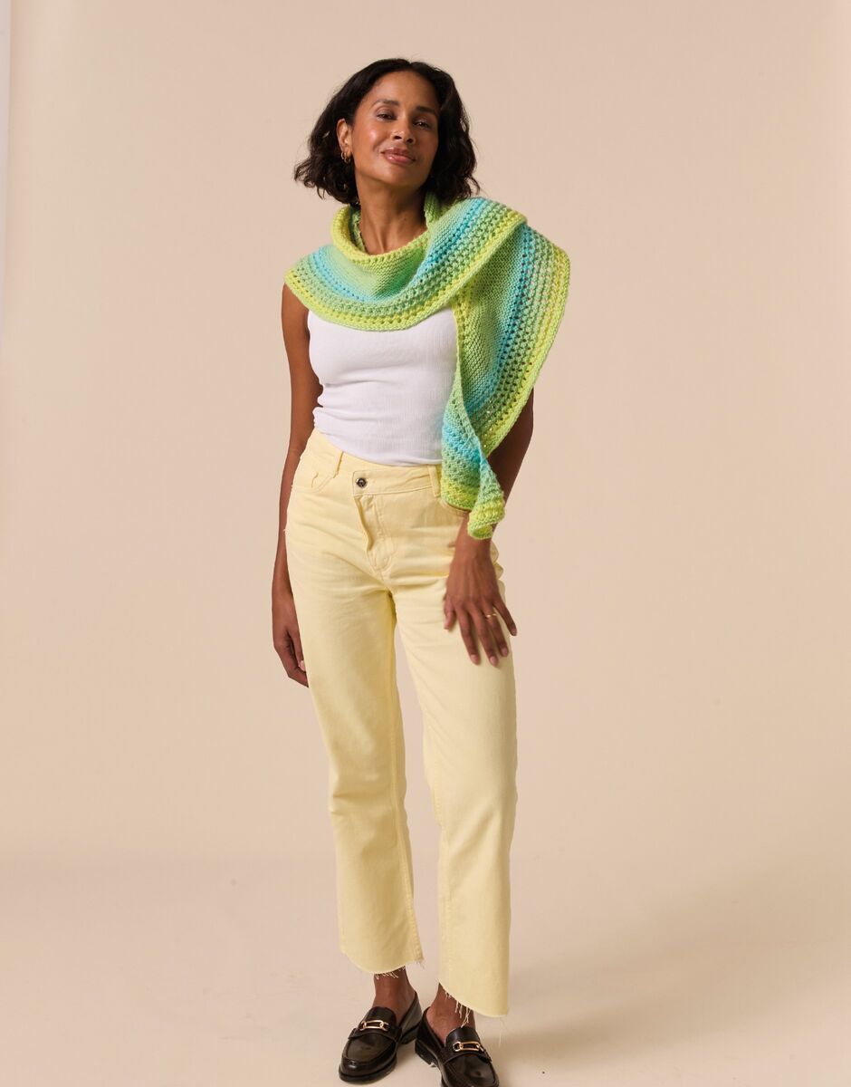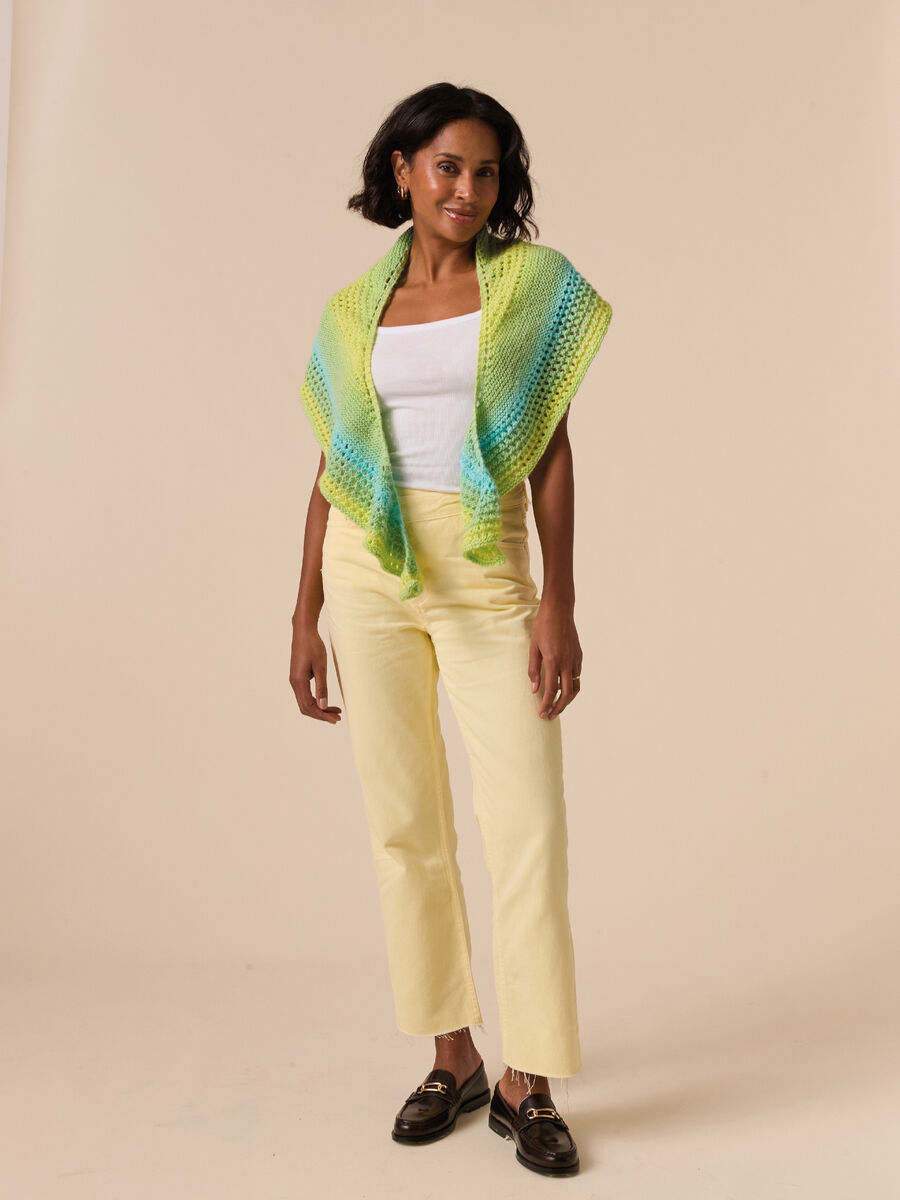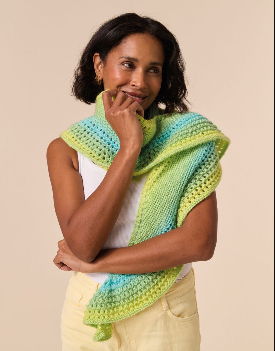 A generous shawl from just one ball of Jewelspun Ombre! This knitting pattern uses an interesting combination of eyelet and garter stitches and is worked from the centre outwards, creating a crescent shape that gently hugs the shoulders. Slight variations in the start point make each ball of Jewelspun Ombre unique, which means that the colour placement in your project will be unique too.