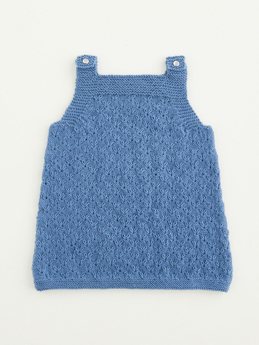 A pretty pinafore dress and bonnet set to knit for your new arrivals. Our designers were inspired by A Walk In The Woods and have contrasted an all-over bud-like stitch pattern with garter stitch trim and bonnet ties.
