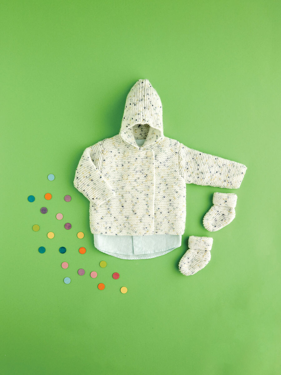 Simple garter stitch makes this hooded jacket and bootie set for boys and girls an easy project for you to knit again and again in any of the playful dotty...