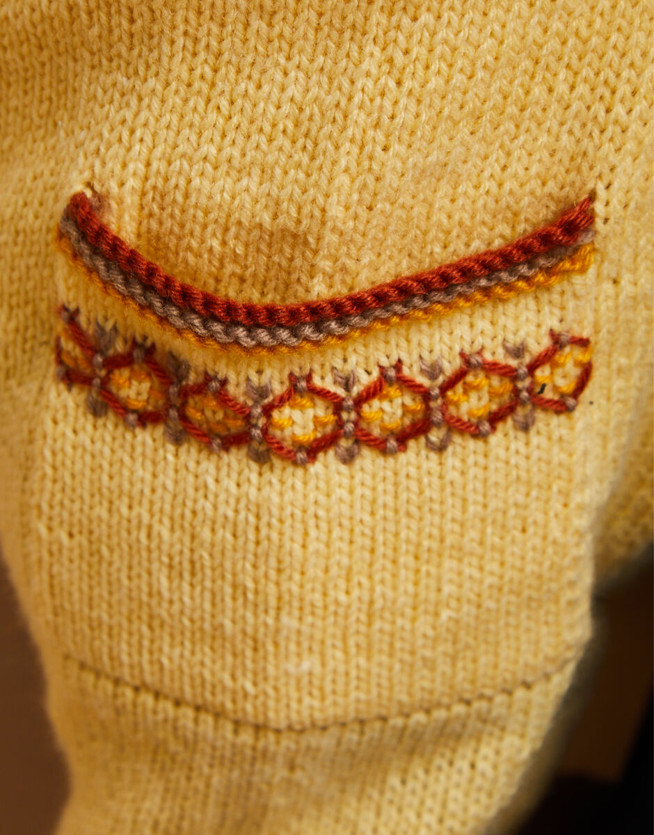 Knit this romper with the matching bib for your little one, ready for sunny days out. The romper has a button placket at the front for fastening and detailed embroidery on the pockets.