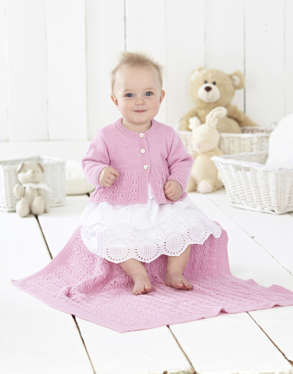 Coat, bonnet, booties and blanket from premature to 2 years knitted in a finer weight brings delicate stitch details to knits. Classic pastels and baby brights for fun nursery knits, stay soft and colourfast through repeated was and wear.