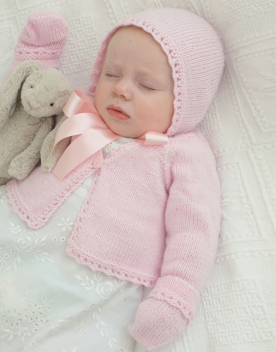 Round and v neck cardigan with matching bonnet, mittens and booties from premature to 1 year knitted in a finer weight brings delicate stitch details to knits.