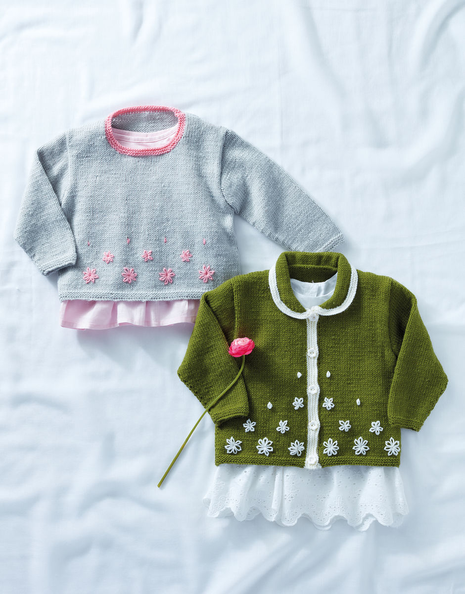 Daisy details finish off this round neck sweater and cardigan. Knitted in Sirdar Snuggly Double Knitting, this set is perfect for babies from newborn up to two years.