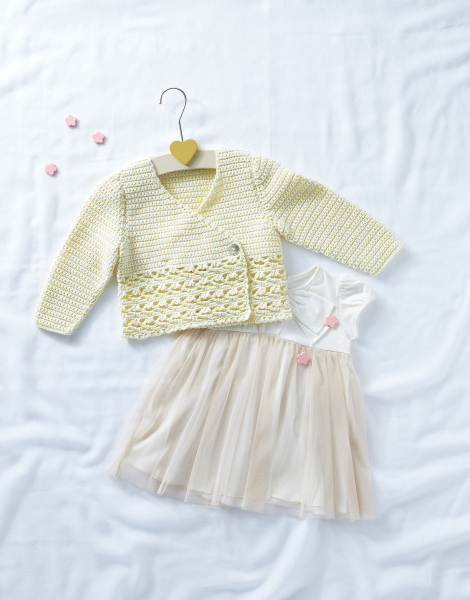 Delicate crochet lace makes this V-neck cardigan with set-in sleeves extra pretty. Make this summery style from Snuggly Soothing Double Knitting for babies...