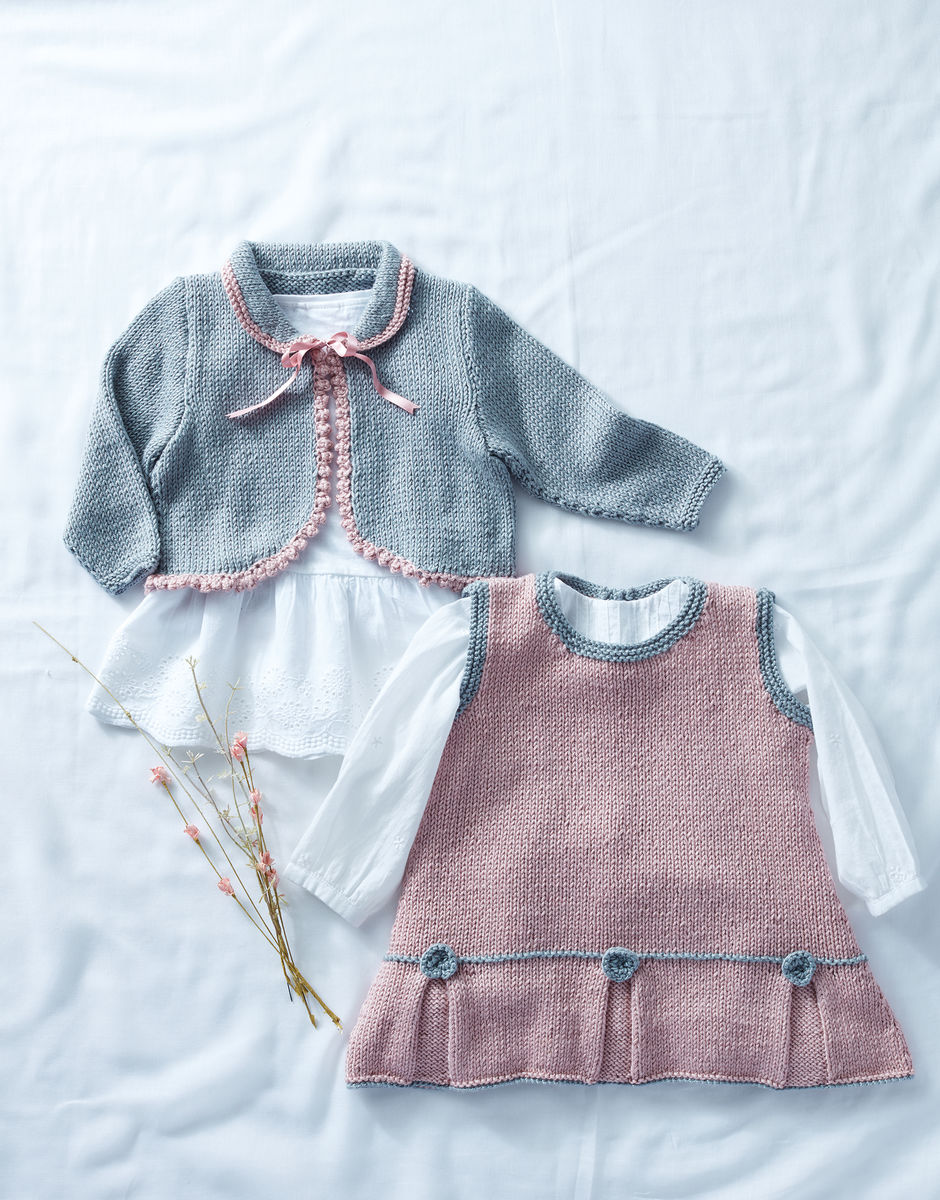 Pleats, picot edging and garter stitch trims bring this duo of knits together. The pattern includes a pinafore dress and matching cropped cardigan that knit...