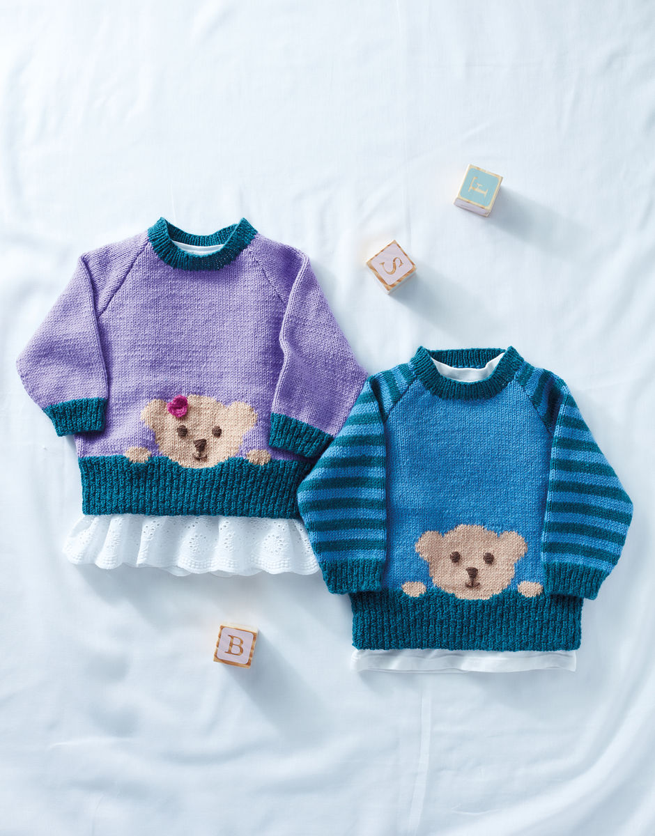 A lovely pair of raglan sweaters, both with an adorable colourwork teddy bear motif. This pattern is a great choice for newborns, and babies up to two years. Knitted in Sirdar Snuggly double knitting, you can add stripes to the sleeves or leave them plain.