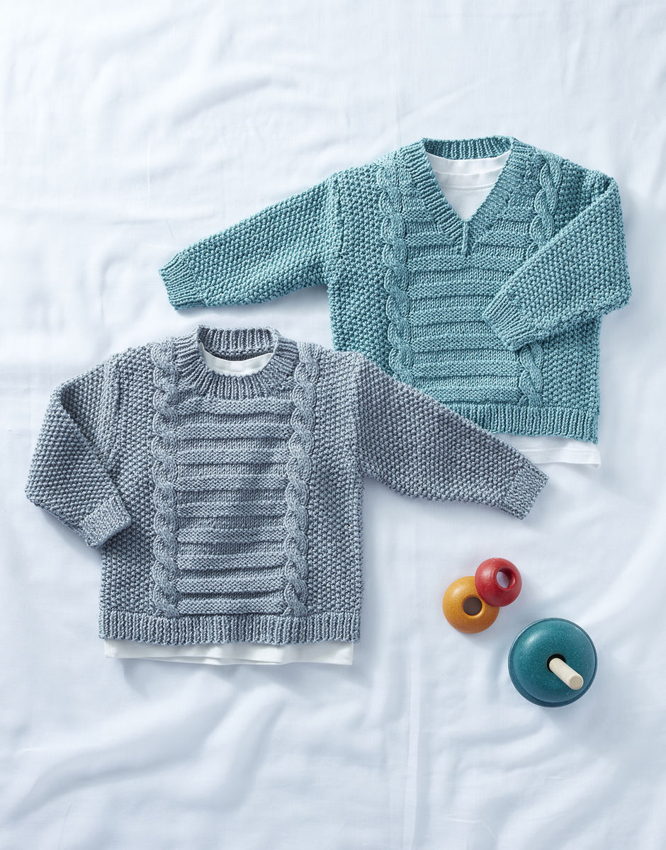 A cute pair of knits in Sirdar Baby Bamboo double knitting that would make a thoughtful gift for a baby from birth to two years. The pattern includes a round-neck and V-neck sweater, both with cable and textured stitch details. Take your pick from the wide range of irresistible colours in this super-soft, machine-washable yarn.