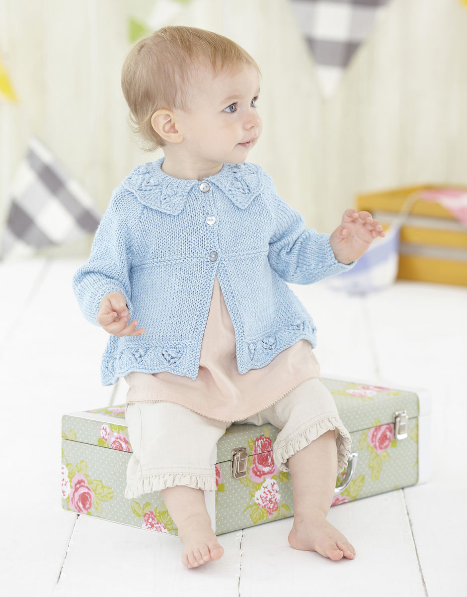 Collared and round neck cardigan for babies and little ones knitted with an incredibly smooth yarn. The sixteen baby-friendly colours will remain soft and smooth with gentle machine washing.