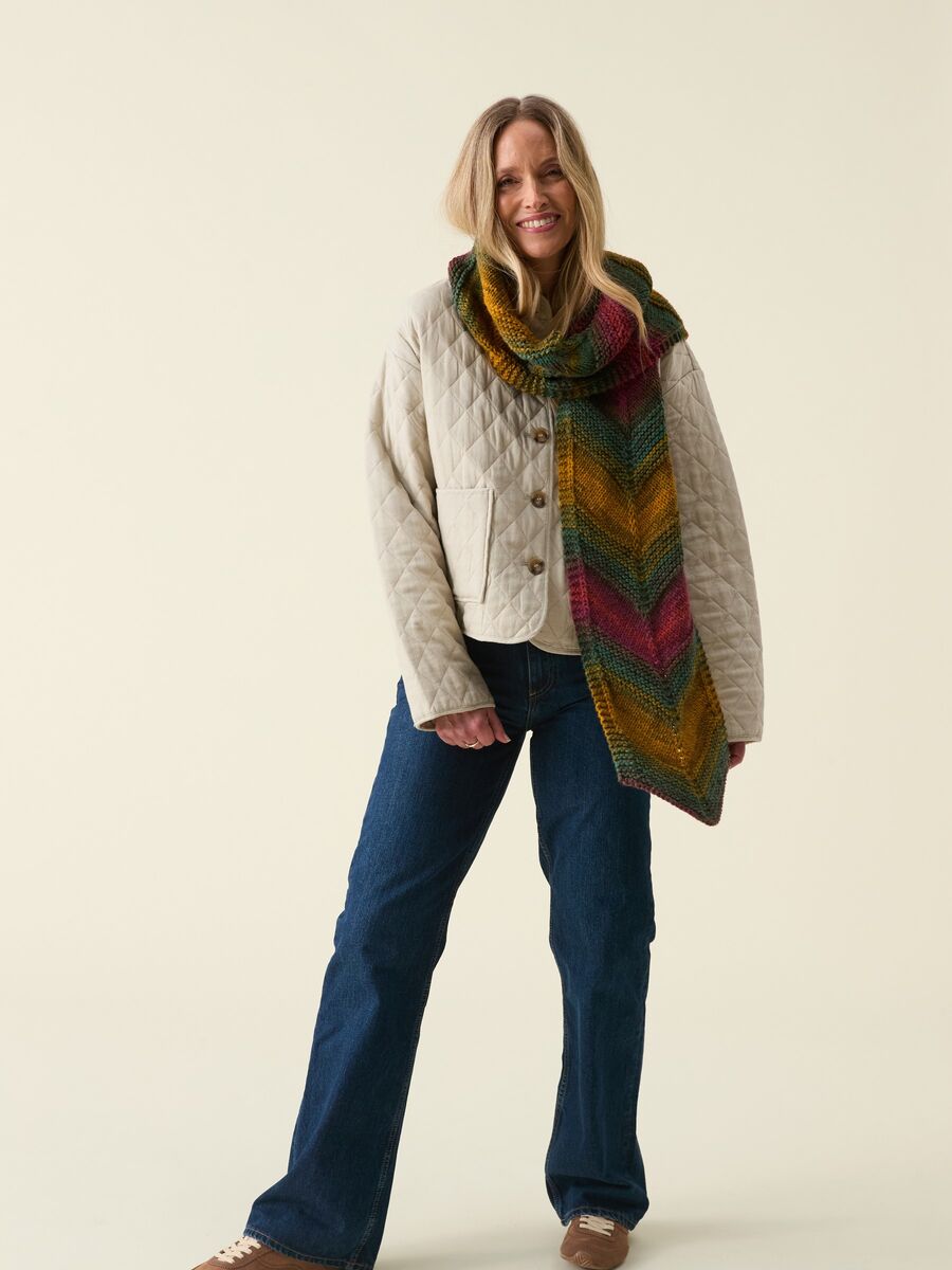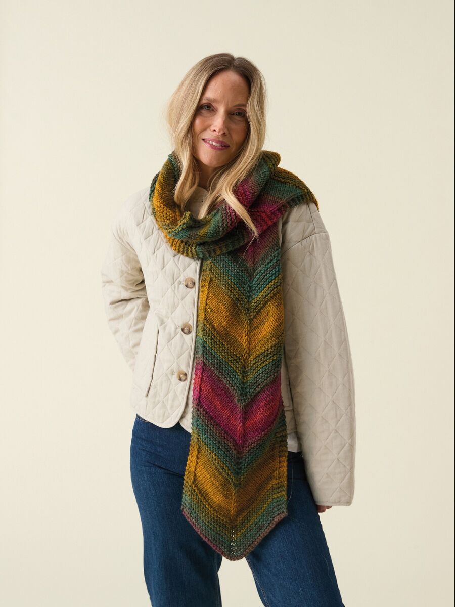 A cost-effective knit using just three balls of self- striping Hayfield Spirit Chunky. This striking chevron knitting pattern creates an elegant ‘arrow’ shape scarf to add a pop of seasonal colour to your outerwear.