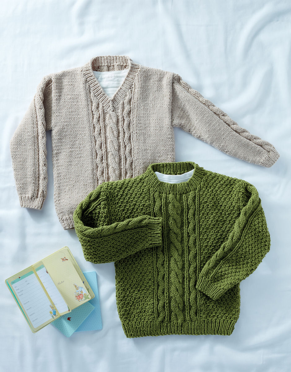 These beautifully finished V-neck and round-neck sweaters are perfect for kids of all ages. Featuring cable details and the option of stocking stitch or moss stitch, these sweaters are made in Super soft Aran yarn.
