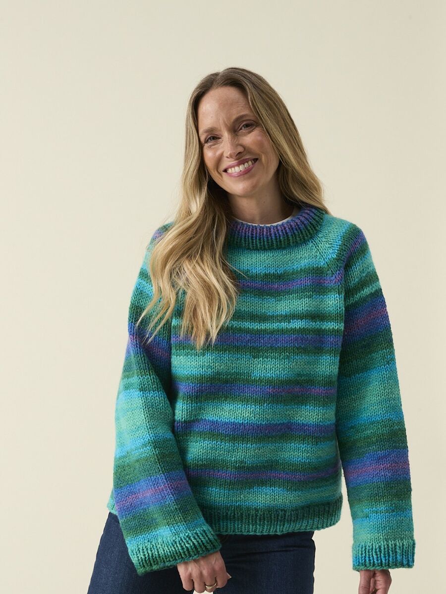 Knit the Circular Raglan Sweater in-the-round from the bottom up. This technique creates ‘square’ stripes at the yoke, wide stripes on the sleeves and thinner stripes on the body, beautifully showcasing just some of the effects you can achieve with self-striping Hayfield Spirit.
