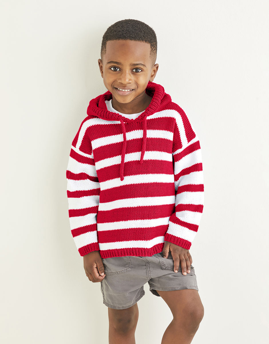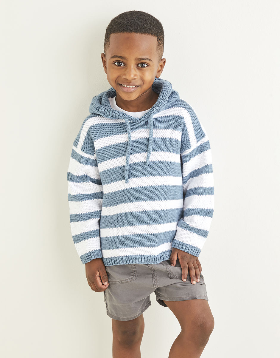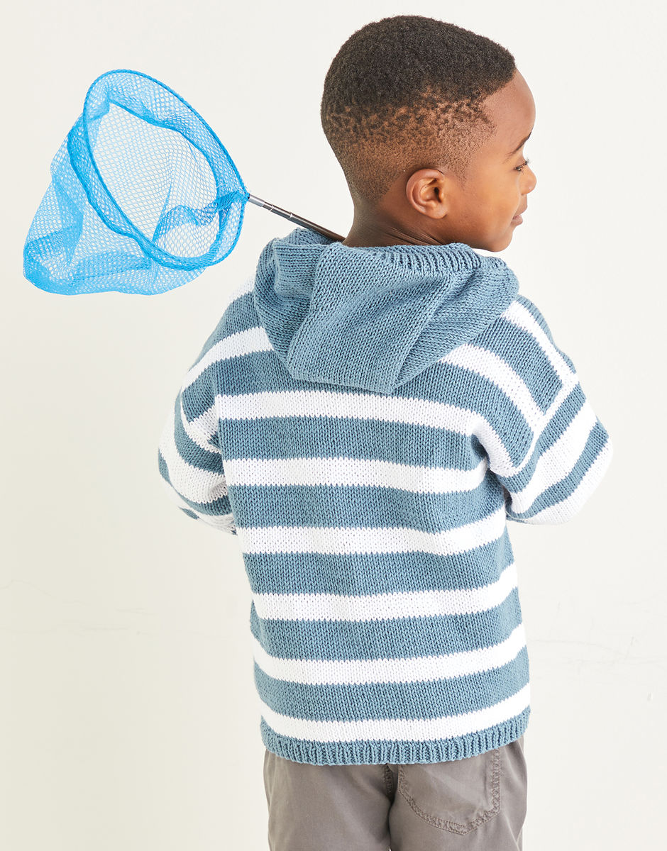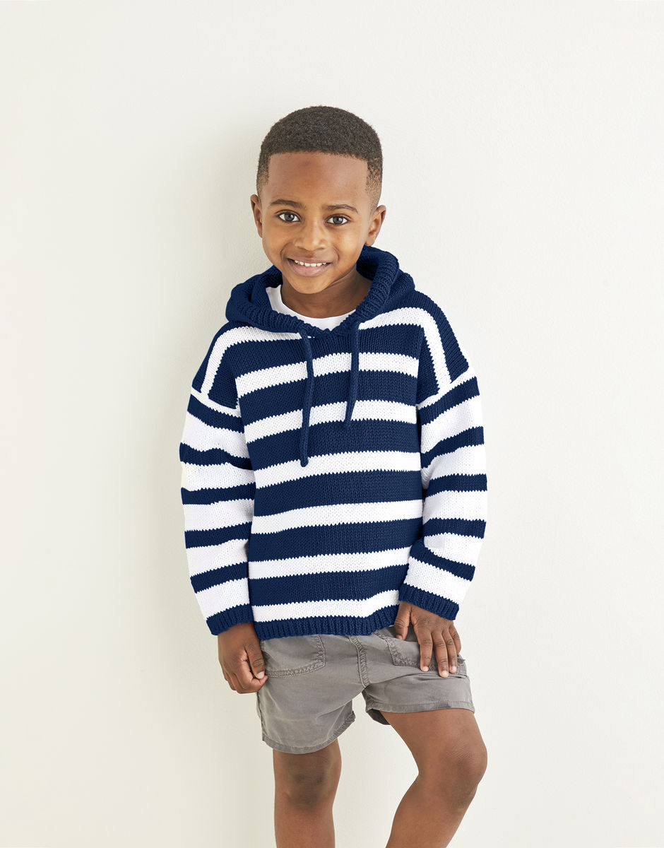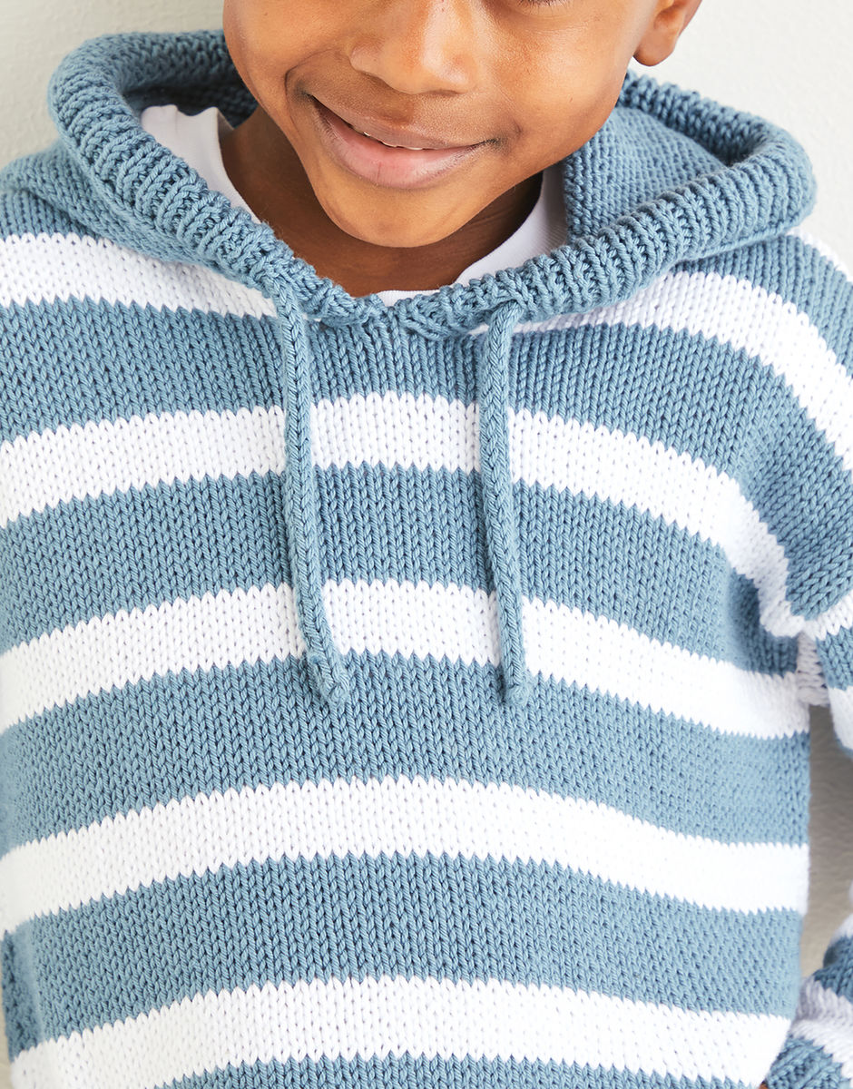 When action-packed days call for comfortable, practical dressing, our cotton hoodie fits the bill. The deckchair-inspired stripe in nautical shades has a proper seaside vibe. Now then, which way to the beach? Knitting level: Intermediate You will also need: 1 Pair of 4mm (UK8 – USA6) Knitting Needles, 1 Pair of 3.25mm (UK10 – USA3) Knitting Needles. Stitch Holder (1Pair of 4mm Double Pointed Needles).