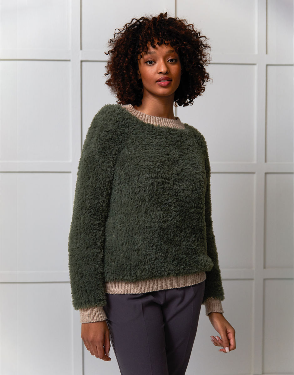 Combine Sirdar Alpine and Country Classic to make this super cosy fluffy sweater with rib trims. With instructions for sizes UK 8-26 (USA 4 -22), this soft knit is the ideal addition to your winter wardrobe.