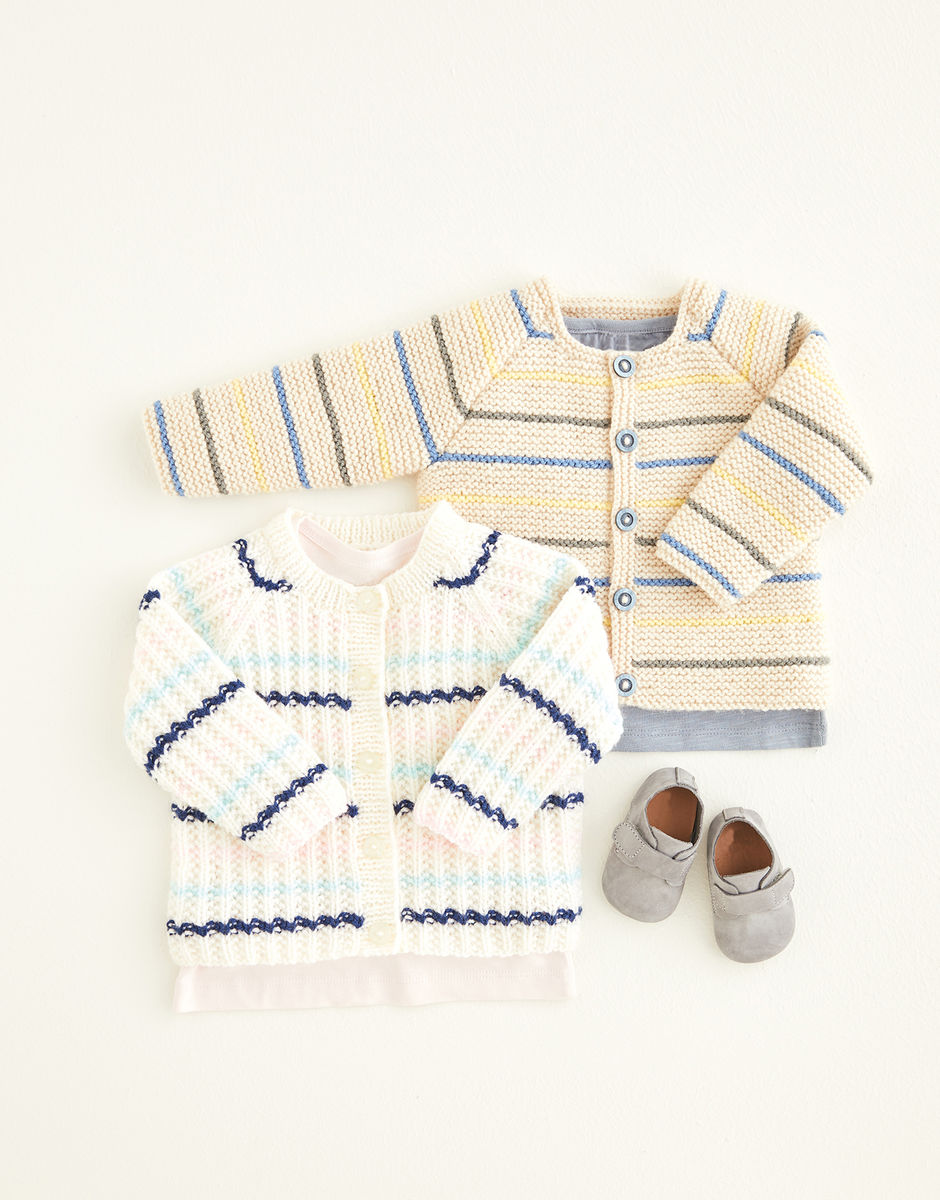 Round neck or crew neck, garter stitch or rib stitch, knit these striped cardigans in soft, machine washable Hayfield Baby Bonus DK again and again as your...