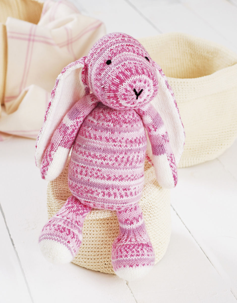 Toy bunny design knitted with Snuggly Crofter DK. Snuggly Crofter is a gorgeously soft self-patterning fair isle effect yarn inspired by the Scottish Highlands, which retains its softness through washing and tumble drying.