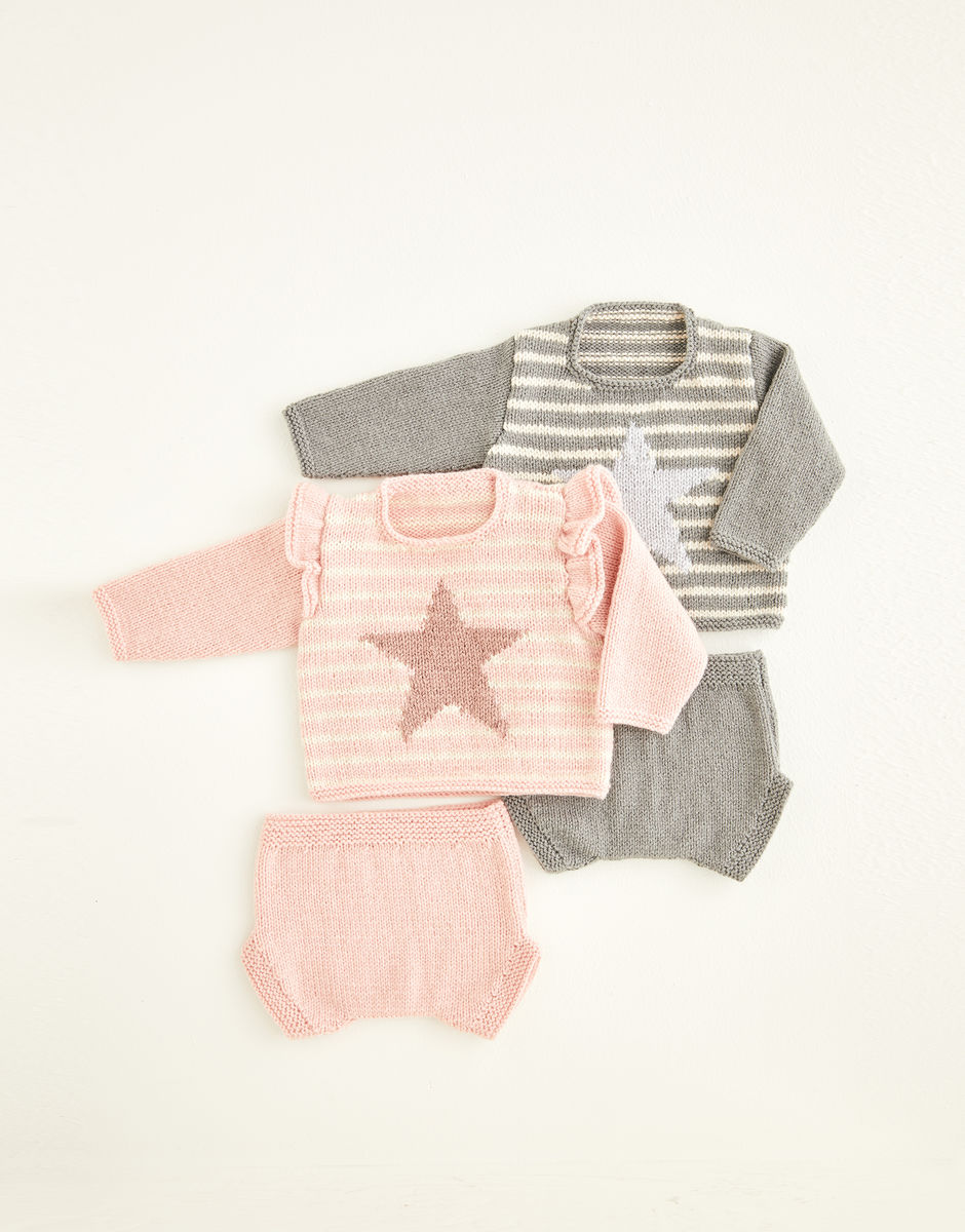 Treat your little star to an adorable two-piece from our Wishing On A Star collection in Hayfield Baby Bonus DK. With or without frills, the striped intarsia star sweaters are super-cute and the equally the sweet matching pants have practical garter stitch waist and leg cuffs to keep baby’s nappy under wraps. Knitting level: Advanced You will also need: 1 pair of 4mm (UK8 – USA6) Knitting Needles, 1 Pair of 3.25mm (UK10- USA3) Knitting Needles and Stitch Holders.