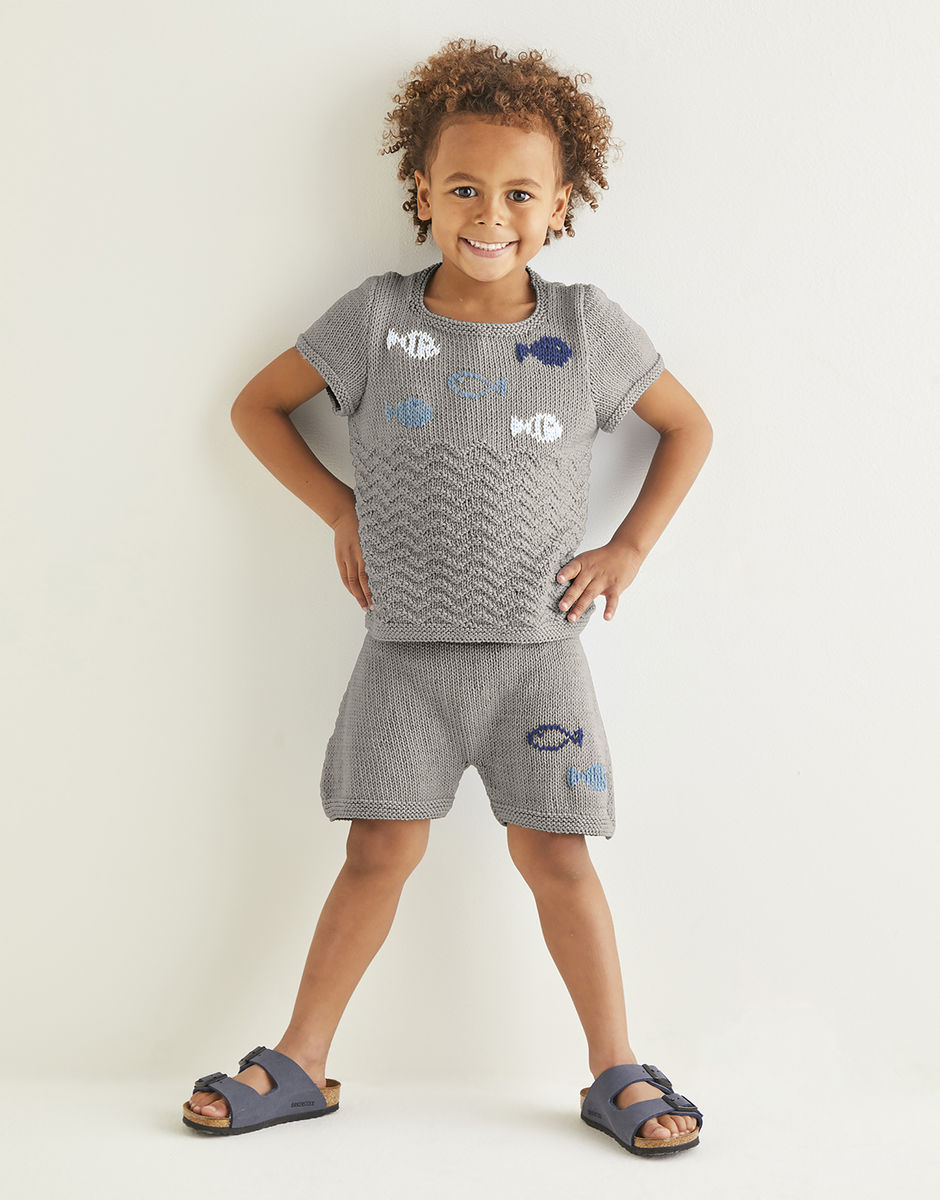 A cute top and shorts set with an under the sea theme ideal for bringing seaside adventures to a park or garden near you, sand pit and paddling pool optional. The easy-to-pull-on style makes getting dressed child’s play. Knitting level: Intermediate You will also need: 1 Pair of 4mm (UK8 – USA6) Knitting Needles, 1 Pair of 3.25mm (UK10 – USA3) Knitting Needles and 2 3.25mm (UK10 - USA3) Double Pointed Needles. Stitch Holders.
